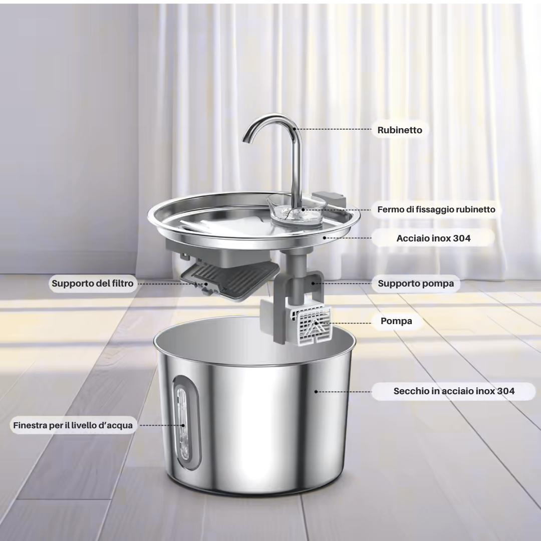 Design a "Rubinetto": Replica l'abitudine naturale del gatto di bere acqua corrente. Il flusso dinamico attira l'attenzione e incoraggia l'idratazione.